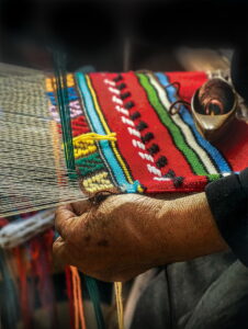 Στη φωτογραφία, η ρόκα και τα δουλεμένα από τον χρόνο χέρια μιας υφάντρας κινούνται επιδέξια πάνω στον αργαλειό, υφαίνοντας ένα ανωγειανό φαντό με πολύχρωμα νήματα. Τα γεμάτα εμπειρία δάχτυλα περνούν το νήμα ανάμεσα στα στημόνια, σχηματίζοντας περίτεχνα γεωμετρικά σχέδια και παραδοσιακά μοτίβα της Κρήτης.